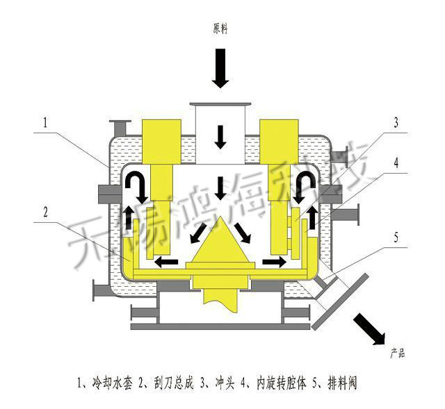 此設備主要是針對電池行業設備,上進料口(負極材料、導電劑、粘接劑、電解質)經機械融合及高精密混合處理,構成不同材料成分的分布,提高產品材料的利用率,構成不同材料的成分顆粒之間的復合化,降低產品的BET比面積,讓產品顆粒以高密度填充;將納米級粉末包覆在微米級的顆粒上,從而改進粉體的許多物理,化學特性。機械融合設備就是基于此原理開發的。物料在轉子中高速旋轉,在離心力的作用下緊貼器壁,在轉子和定子擠壓頭之間高速穿過。在這個瞬間,物料同時受到擠壓力和剪切力的作用,由于高速旋轉,物料在轉子和定子之間循環往復,不斷地受到擠壓力和剪切力的作用,在摩擦力的作用下顆粒表面達到一種機械熔融狀態,從而將納米級的超細粉末包覆在微米級的顆粒上。